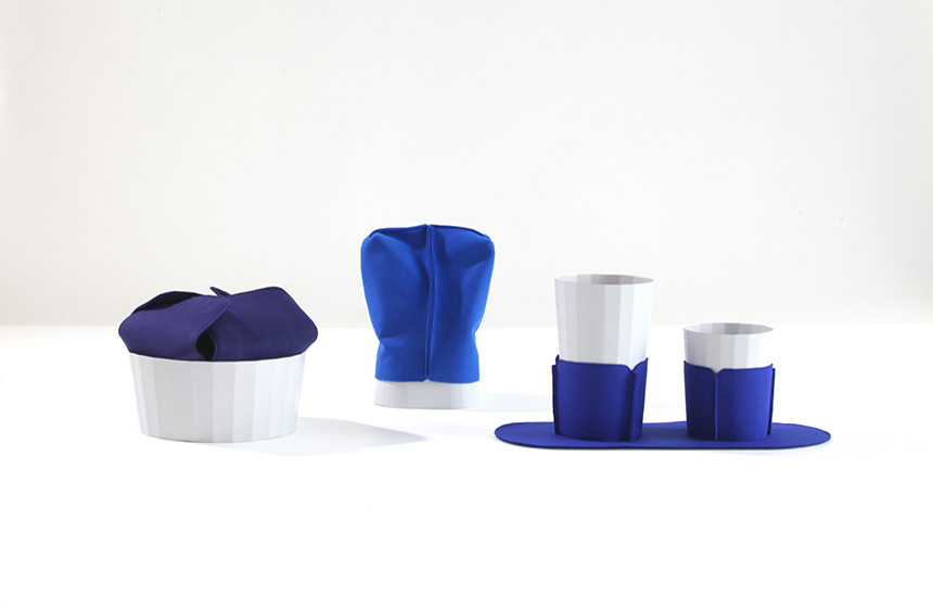 Parure is a containers set made of metal and covered in fabric. Used as extensions, the fabric brightens up the volumes, giving them new attributes. Inside the containers it becomes a setting to accommodate our most precious objects. Outside, it becomes a stand or a cover to protect and hide the objects inside.